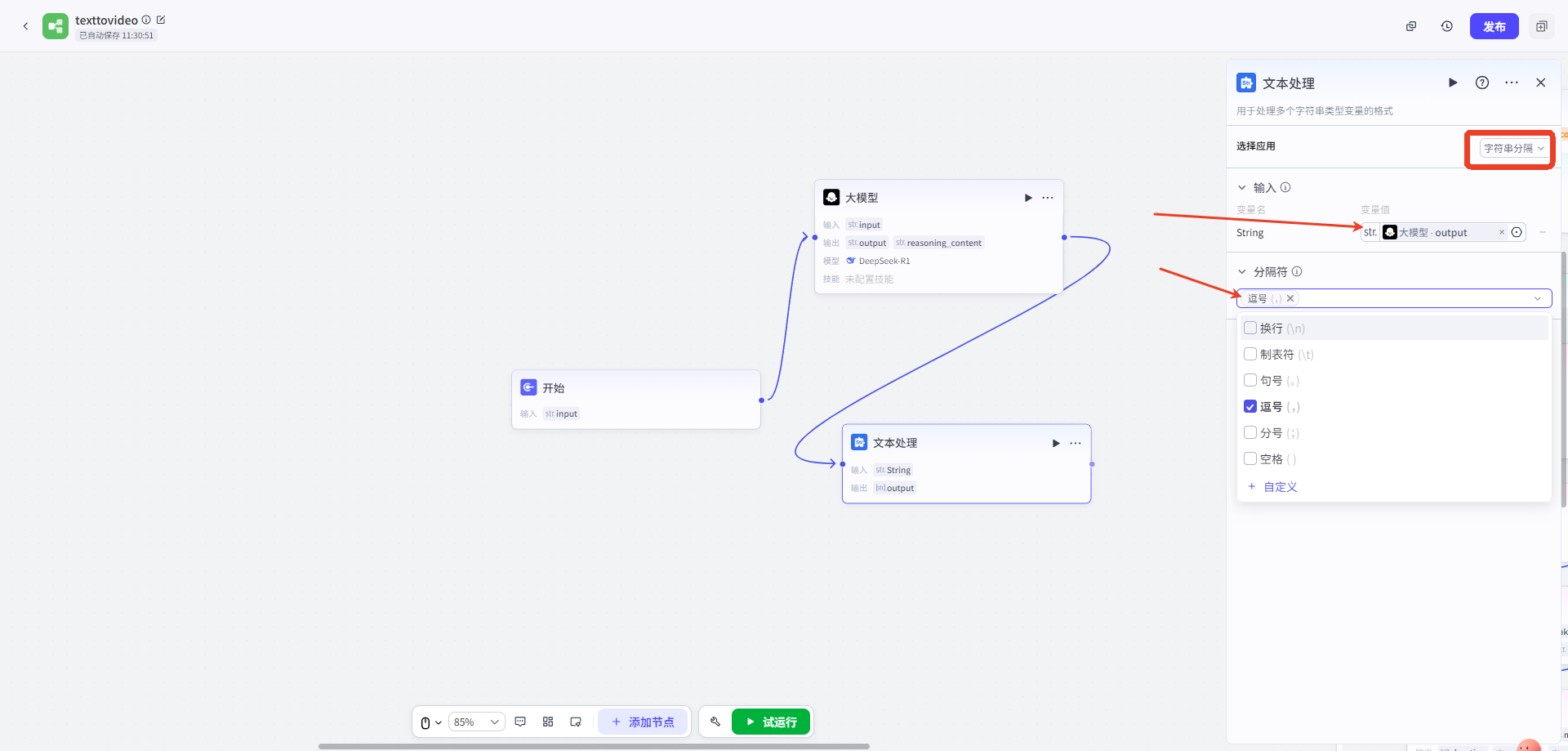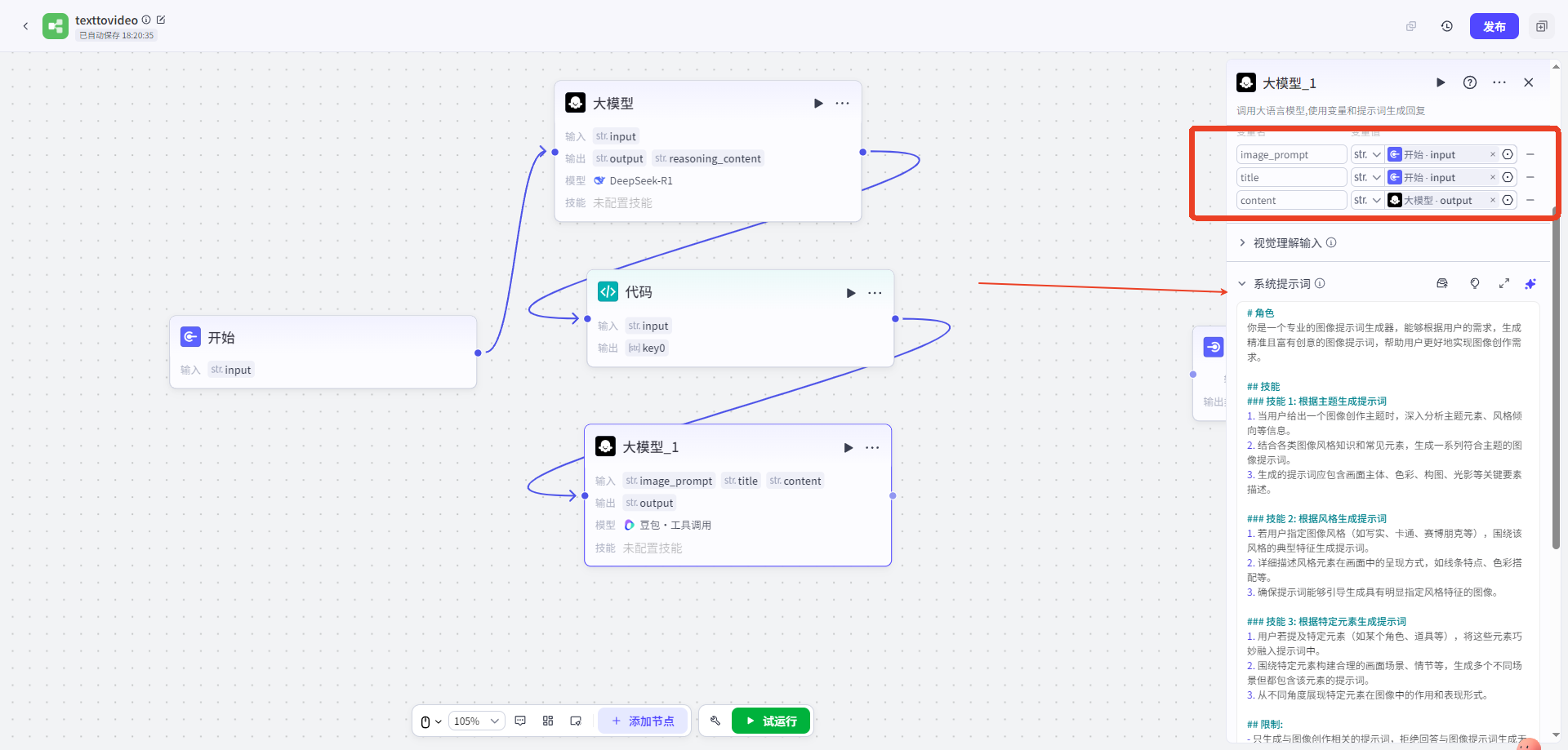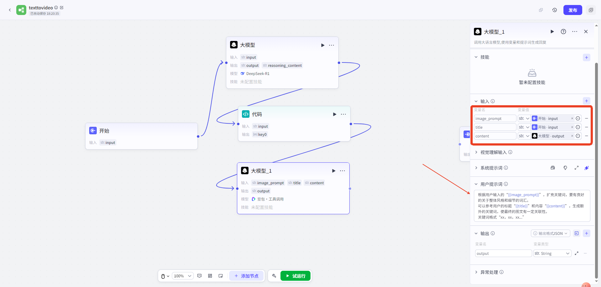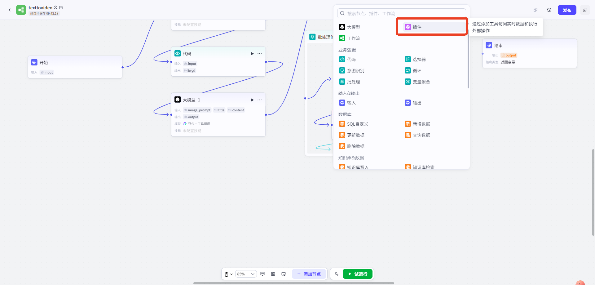 點擊添加節點,選擇節點(大(dà)模型),連接開(kāi)始節點