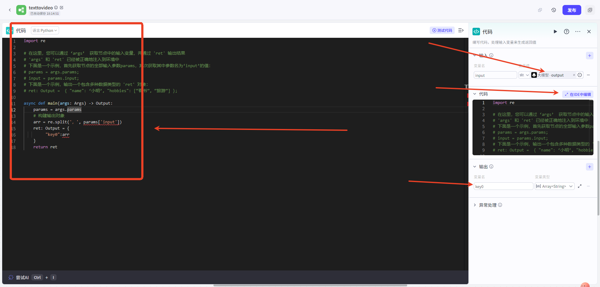 2) 通(tōng)過代碼節點處理(lǐ),在IDE中修改後輸出