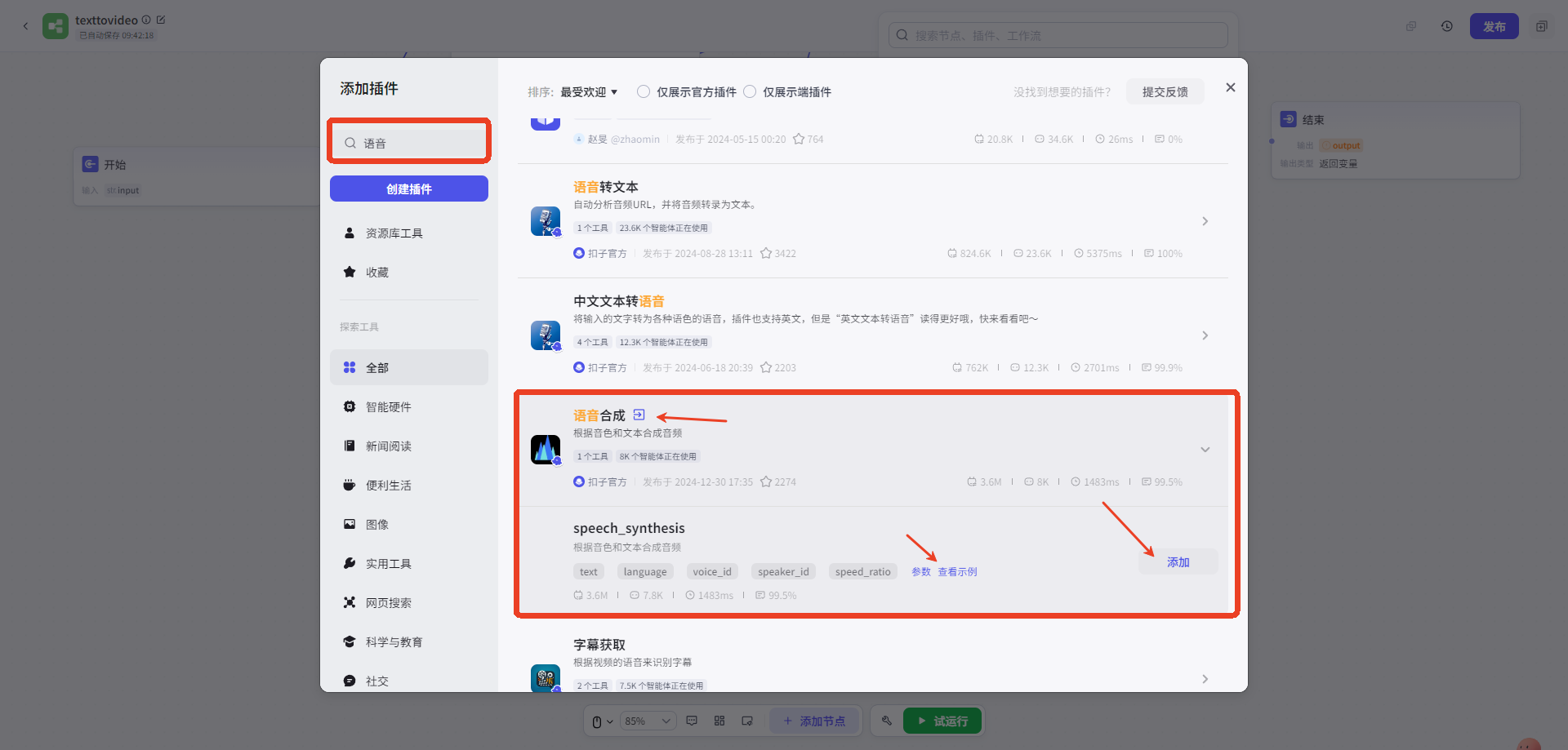 l 搜索語音(yīn),選擇一(yī)款合适的(de)語音(yīn)插件(jiàn)(示例:coze官方的(de)語↔音(yīn)合成)
