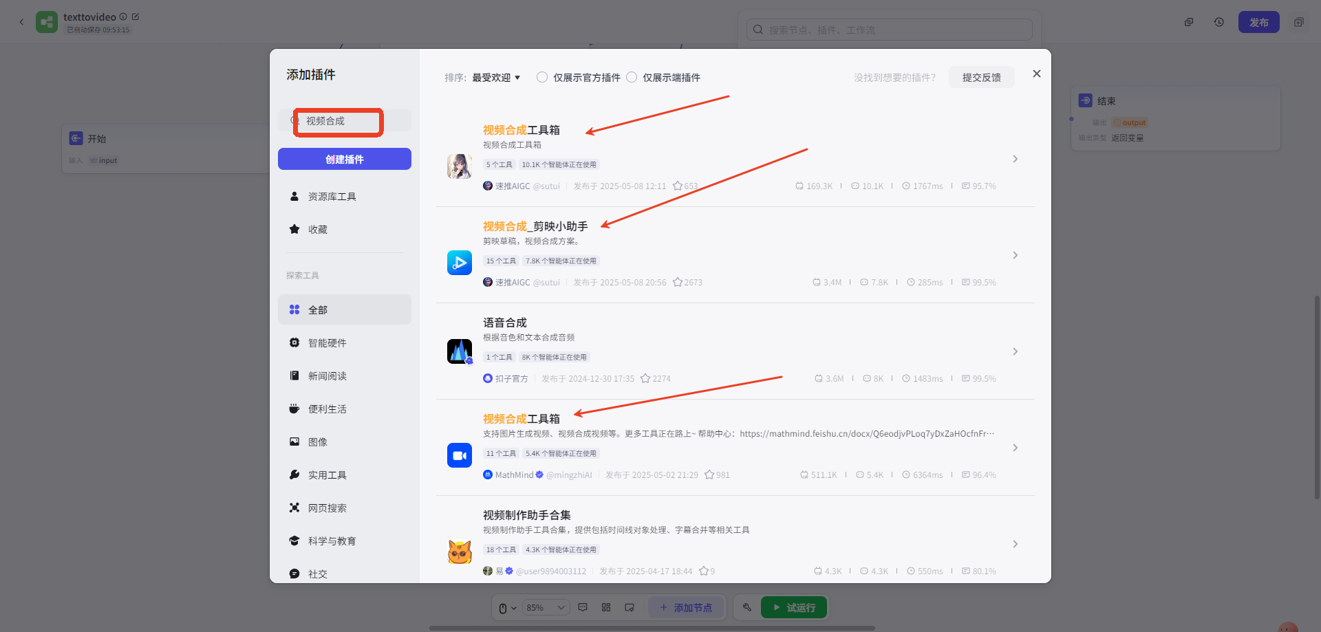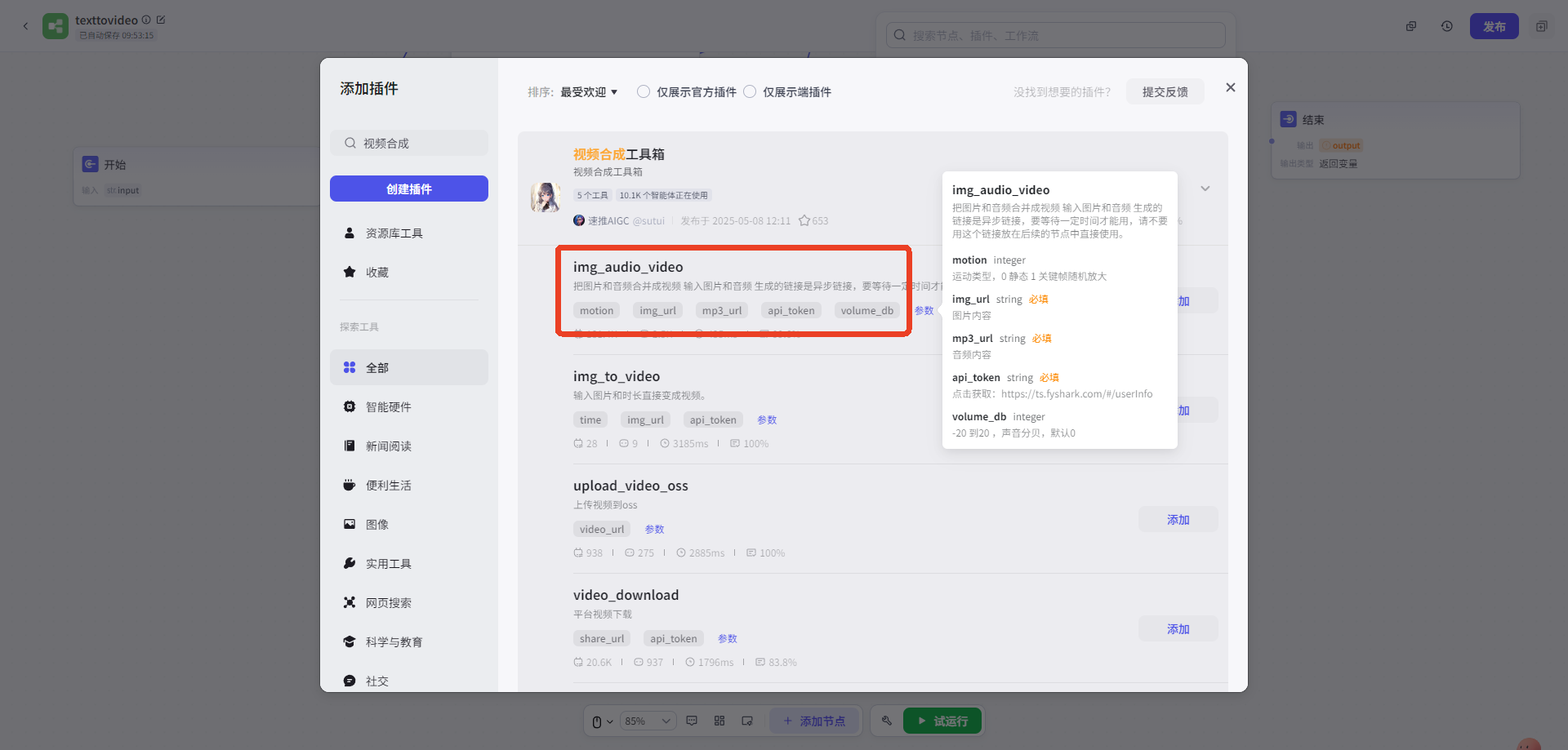 l 搜索視(shì)頻(pín)合成,選擇任意能(néng)夠合成視(shì)頻(pín)的(de)插件(jiàn)(注意:有(yǒu)些®(xiē)插件(jiàn)需要(yào)購(gòu)買api_token)