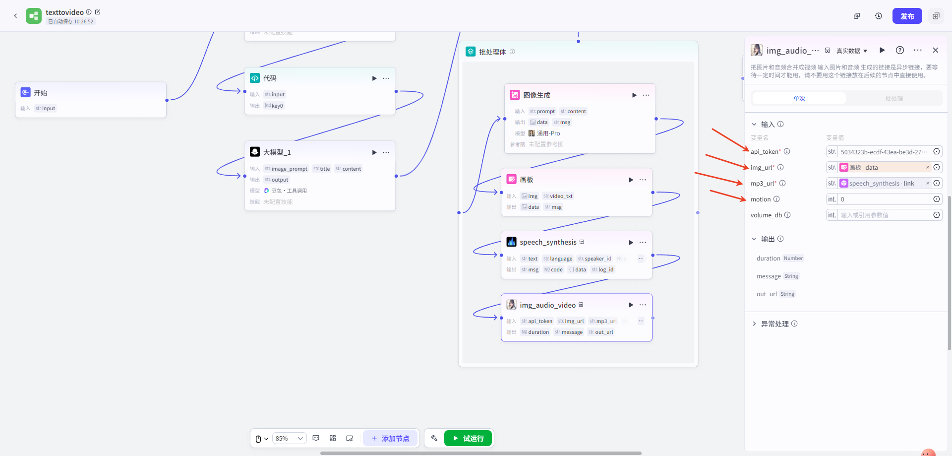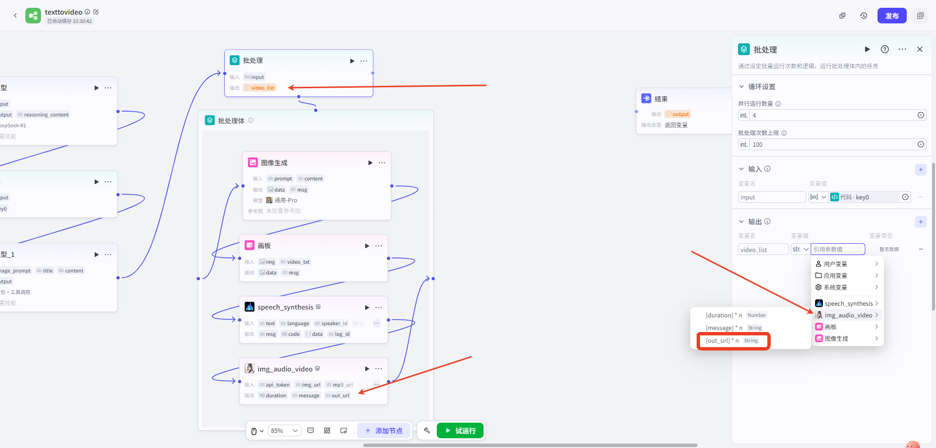 l 連接節點,根據示例填寫參數(shù)(不(bù)同插件(jiàn)需要(yào)填寫參數(shù),要(yào)根據使用(yònεg)的(de)插件(jiàn)調整批處理(lǐ)體(tǐ)的(de)結構)